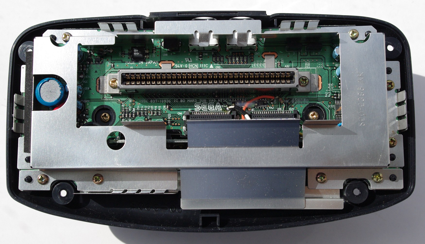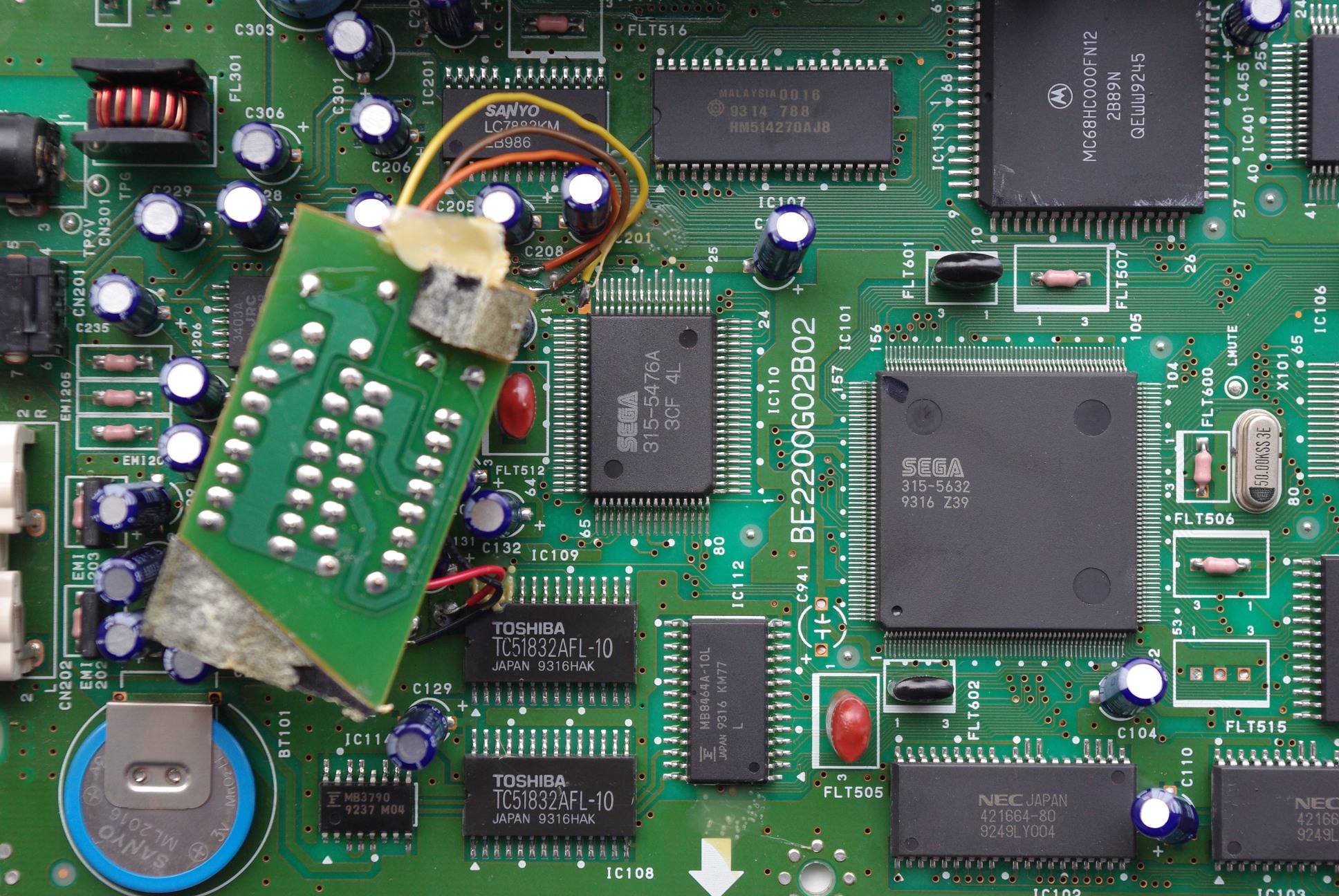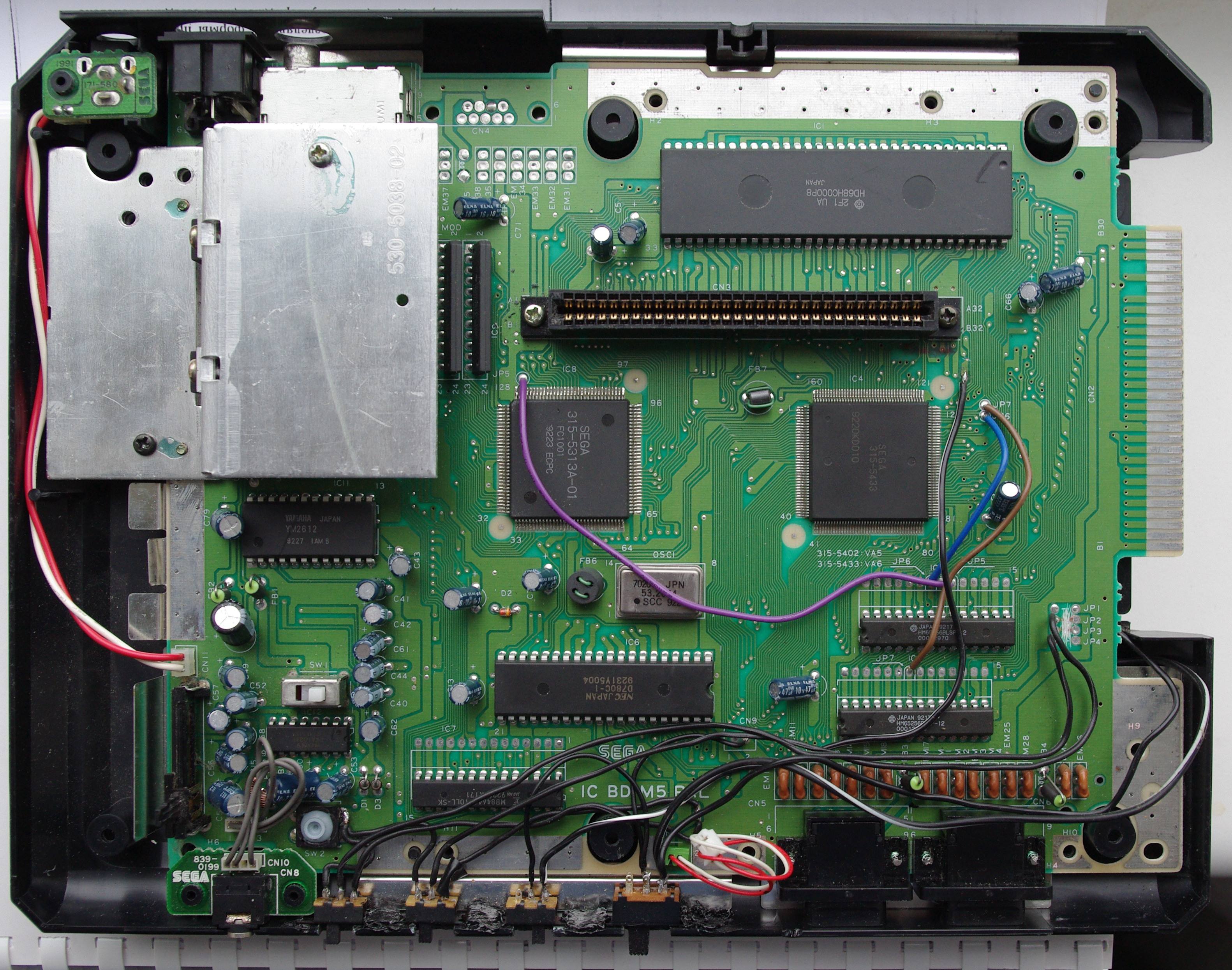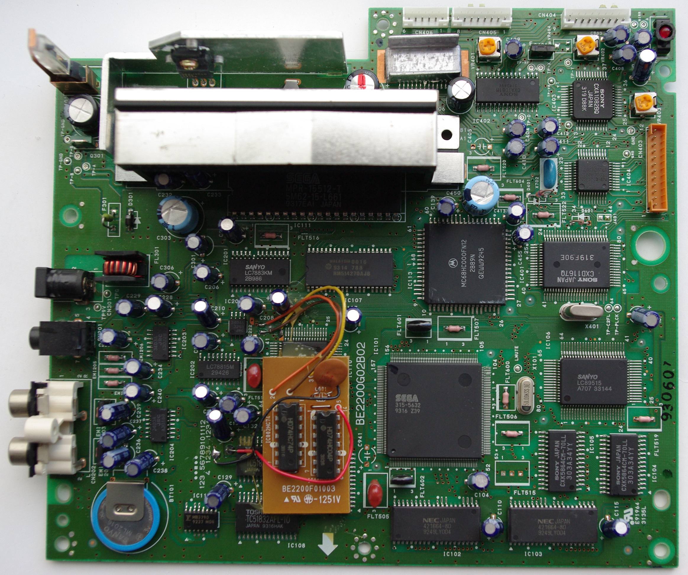 So much hardware for a system used as a CD player by most games. Has a small board attached with some inverters, probably fixes some desing bug.