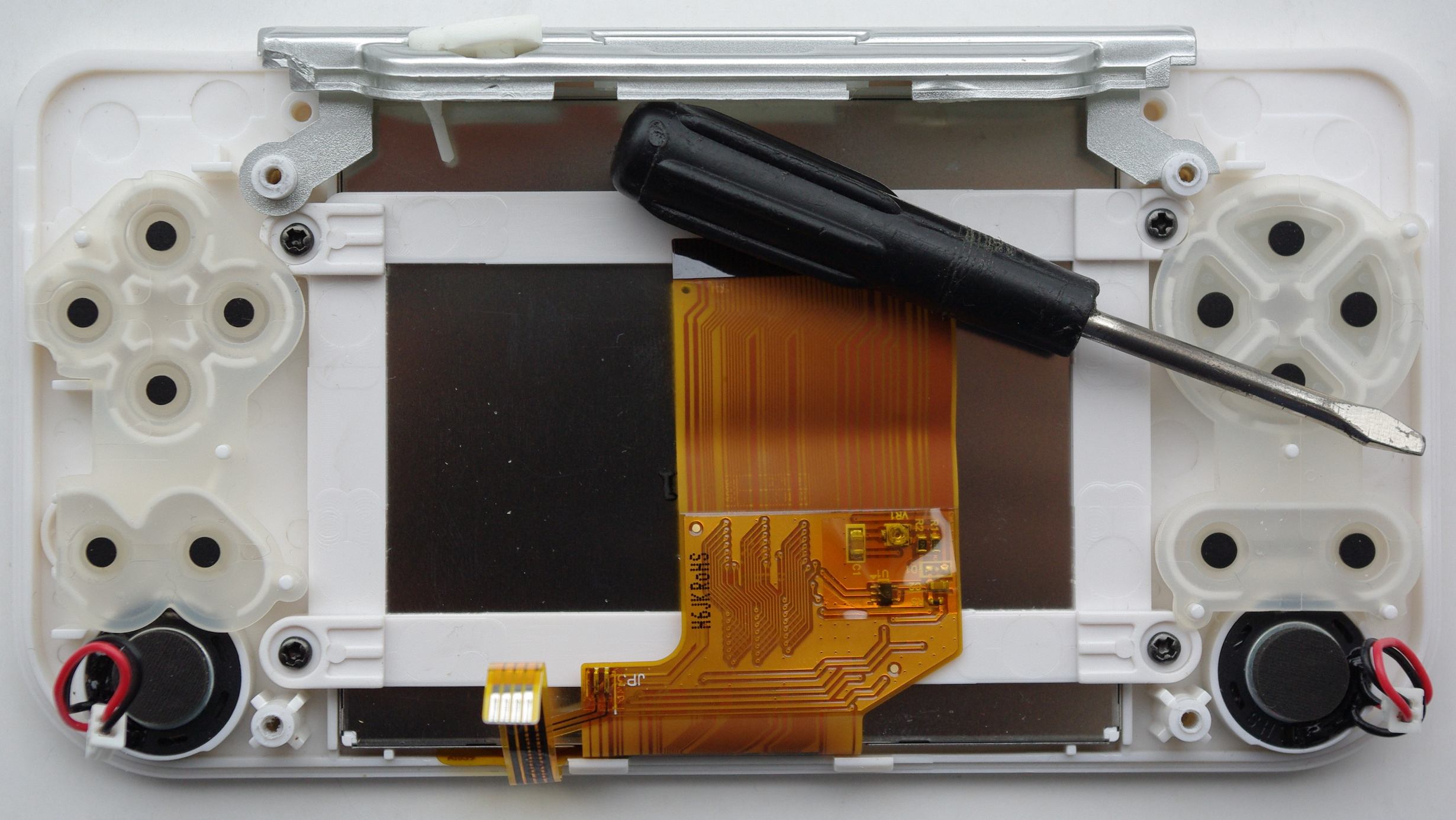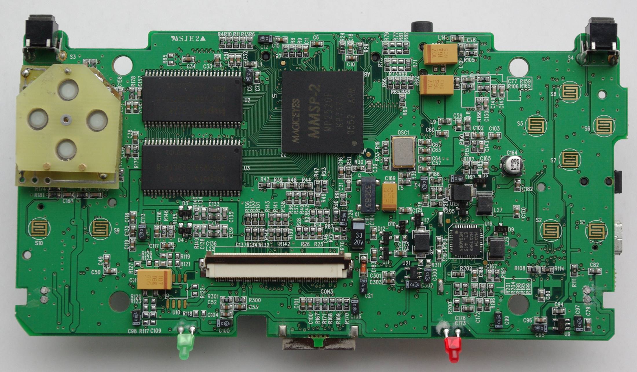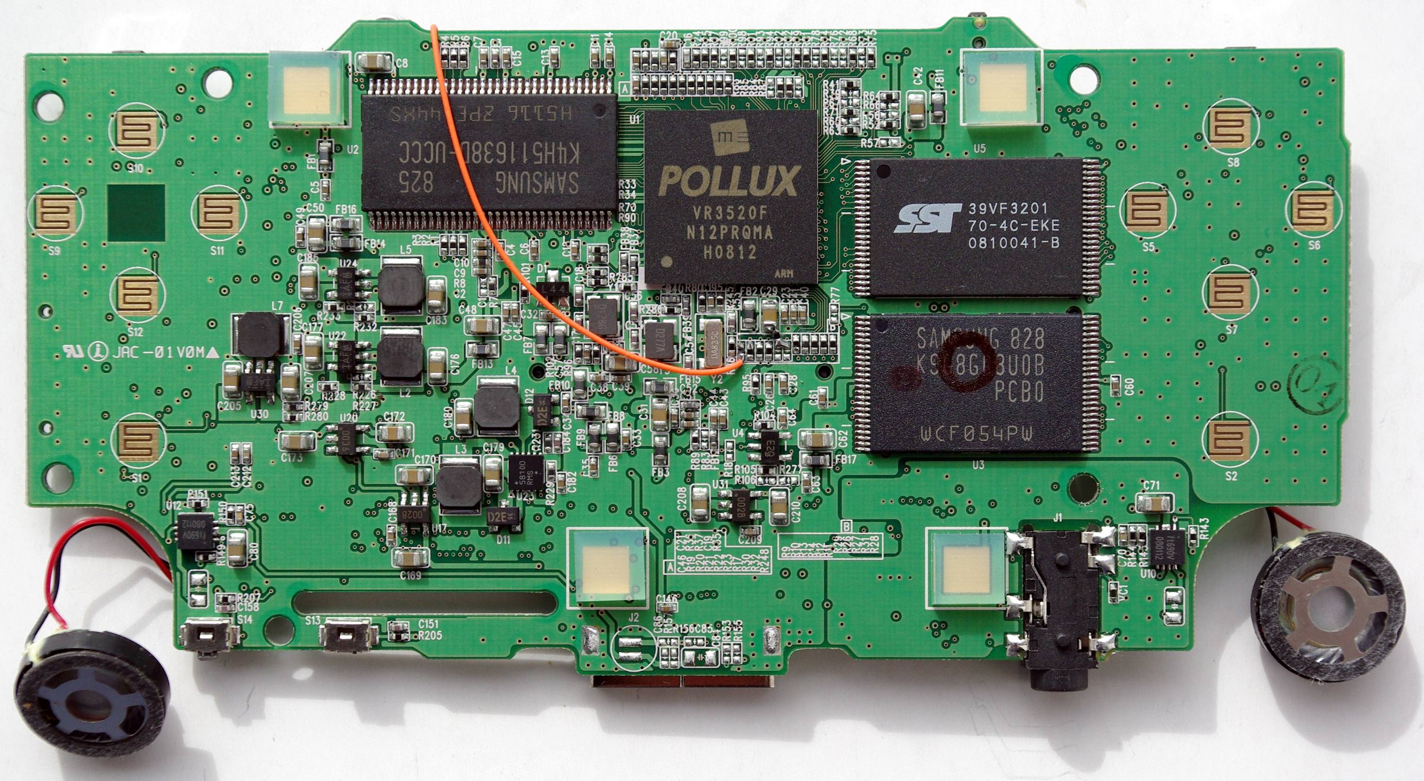 This is GPH GP2X F100 with DaveC's dpad mod applied. It also has a wire near DC connector to work around broken DC/battery switch (which is stuck in "DC connected" state, so that batteries can be used).